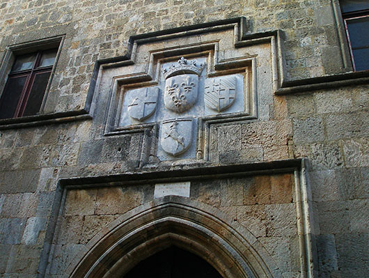 The entrance to the former Inn of Provence with the coat of arms of the Royal House of France, the Order of the Knights of St John, the Grand Master F. del Carretto and Grand master F. de Flota.
