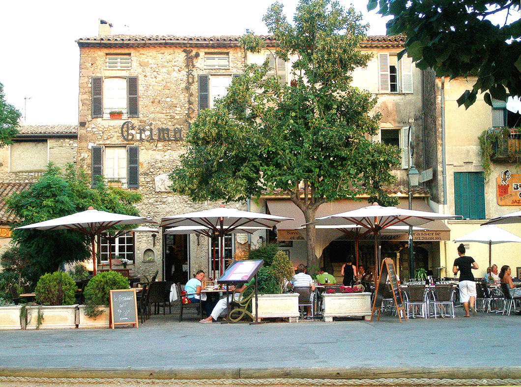 At the core of the lovely village is the little square, lined with a handful of wonderful restaurants and dominated by the Chateau Grimaldi, whose ramparts reward one with panoramic views over the countryside, all the way to the millionaire coast in the distance!