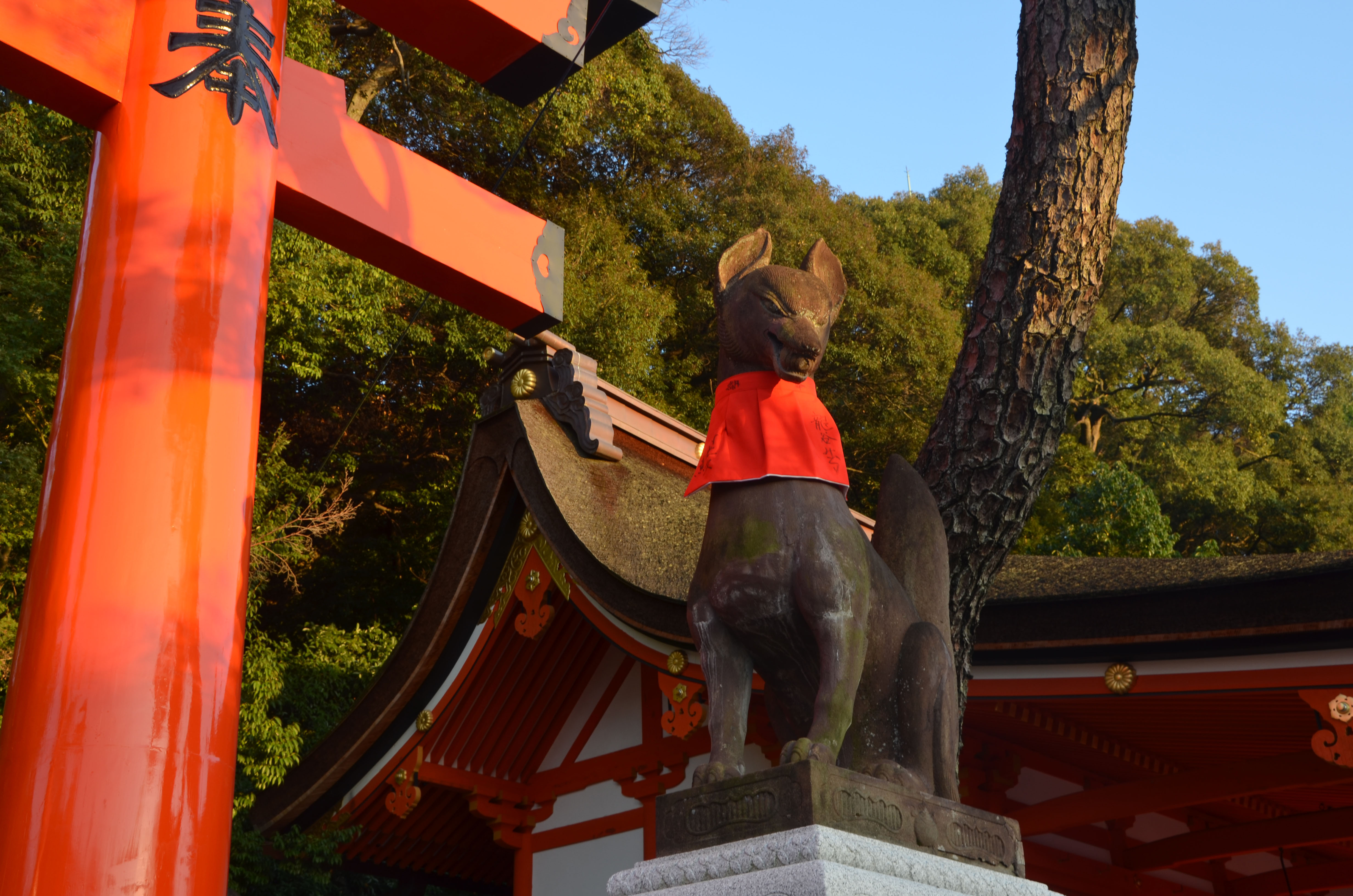 Kitsune are the fox messengers of the Inari Ōkami – the Shinto Goddess of rice, and of fertility and prosperity. Many such Kitusne are to be found around the Fushimi Inari shrine near Kyoto, famous for its vermilion ‘Senbon Torii’ (Thousand Torii gates)