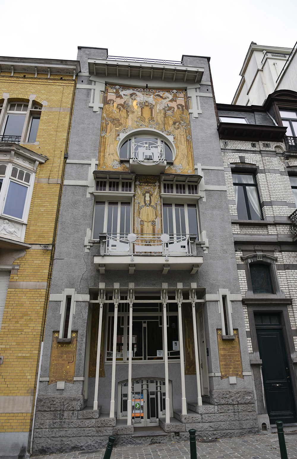 The words “Par Nous — Pour Nous” (By Us – For Us) seem to corroborate the theory that the facade was conceived as a billboard to advertise Cauchie and his painting tutor wife Carolina Voet’s professional artistic skills. The ground floor and basement have been restored and serve as a museum for their work. Sadly only open for visits every first weekend of the month. The top two floors are private apartments.